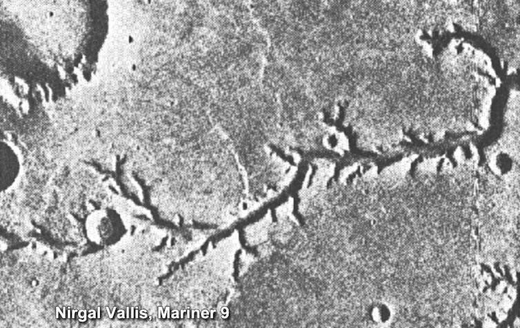 Dans les années 1970, l’attention se porte vers un sujet beaucoup plus excitant : l’eau liquide sur Mars avec la découverte par la sonde orbitale Mariner 9 de canaux fluviaux anciens qui auraient été façonnés par de l’eau qui coule. Ces systèmes de canaux étaient évidemment très anciens (des milliards d’années). Ce qui signifie que, même s’ils prouvaient que coulait sur Mars de l’eau liquide dans les temps passés, cela n’avait aucune incidence sur la présence d’eau à l’heure actuelle.