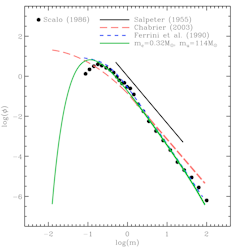 Or, puisque les cœurs denses n’ont pas tous la même masse, les étoiles ne naissent pas avec la même masse. Nous mesurons la masse d’une étoile par rapport à la masse de notre soleil, que nous notons 1 M☉ (lire « une masse solaire », c’est-à-dire une fois la masse du soleil). En observant les étoiles, et en les rangeant en fonction de leur masse on peut établir la distribution en masse des étoiles que l’on appelle fonction de masse initiale. C’est cette fonction initiale de masse, représentée ci-contre, que l’on pensait universelle depuis les travaux de l’américain Erwin Salpeter publiés en 1955.