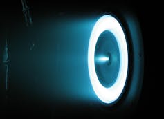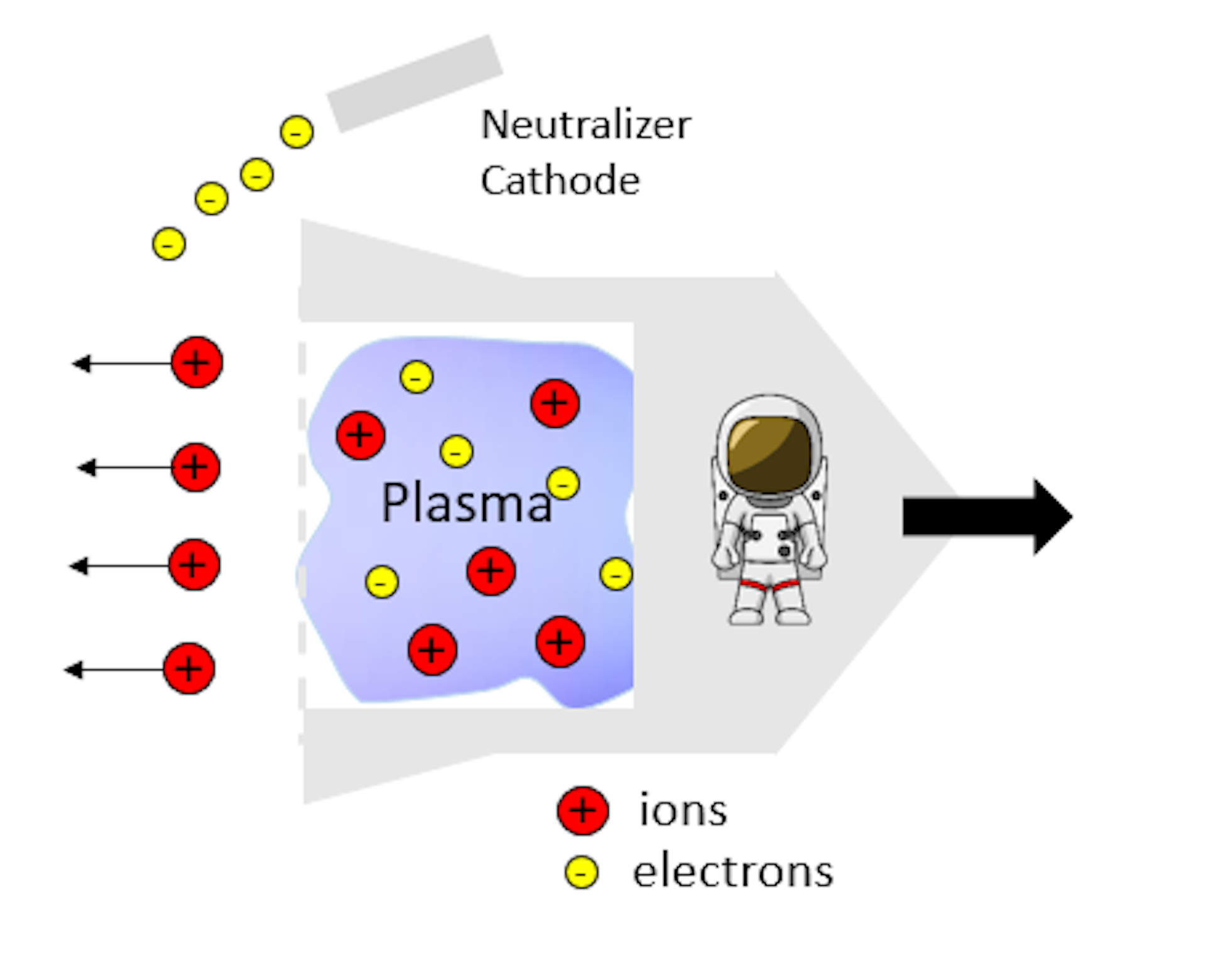 Pour y arriver, nous devons comprendre le fonctionnement d’une fusée au plasma. Elle crée son plasma en injectant de l’énergie électrique dans un combustible gazeux, convertissant des électrons chargés négativement en ions chargés positivement. Les ions sont alors tirés à l’arrière de la fusée, poussant l’engin spatial en avant.