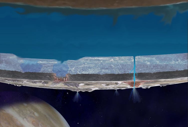 Europe est la plus grande lune glacée de Jupiter (légèrement plus petite que notre Lune). Sur environ 100 km, de la glace et de l’eau liquide entourent son intérieur rocheux.